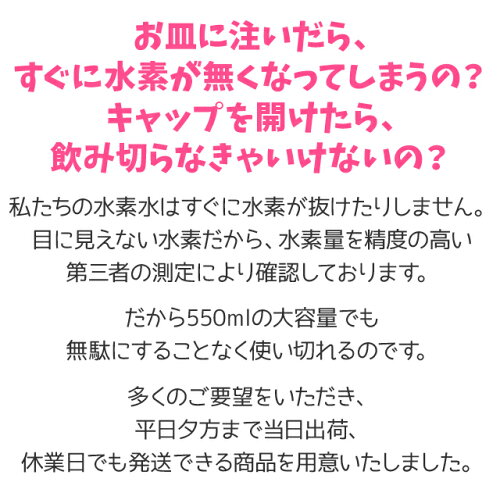 (電気分解やスティックタイプではなく天然水に自然に水素を溶け込ませています)電解水、アルカリイオン水と異なる機能水です。